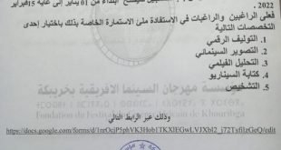 الدورة 22 لمهرجان السينما الافريقية من 12 الى 19 مارس —- اعلان — التسجيل في ورشات المهن السينمائية التسجيل مقتوح من 1 يناير الى 15 فبراير 2022 على الراغبين في الاستفادة اختيار احدى التخصصات وملء الاستمارة حسب الرابط الموجود في الاعلان